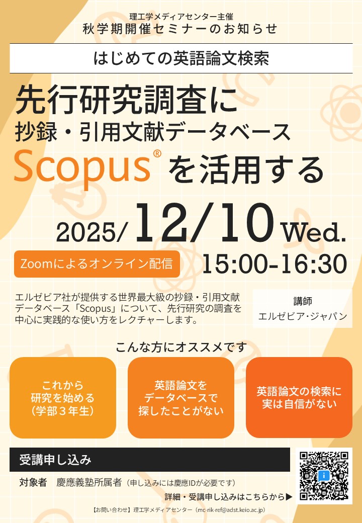 エルゼビア社が提供する世界最大級の抄録・引用文献データベース「Scopus」について、先行研究の調査を中心に実践的な使い方をレクチャーします。